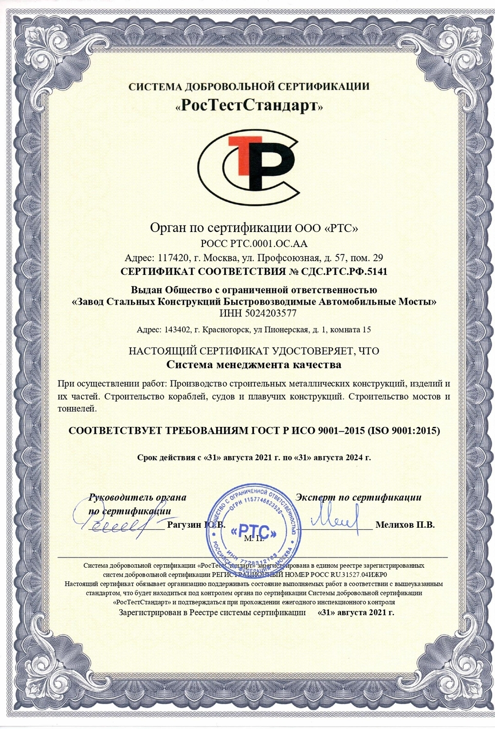 "ЗСК БАМ" сертифицирован по ГОСТ Р ИСО9001-2015. В компании создана система менеджмента качества (СМК), соответствующая требованиям стандарта ISO 9001:2015. При осуществлении работ: Производство строительных металлических конструкций, изделий и их частей. Строительство кораблей, судов и плавучих конструкций. Строительство мостов и тоннелей.